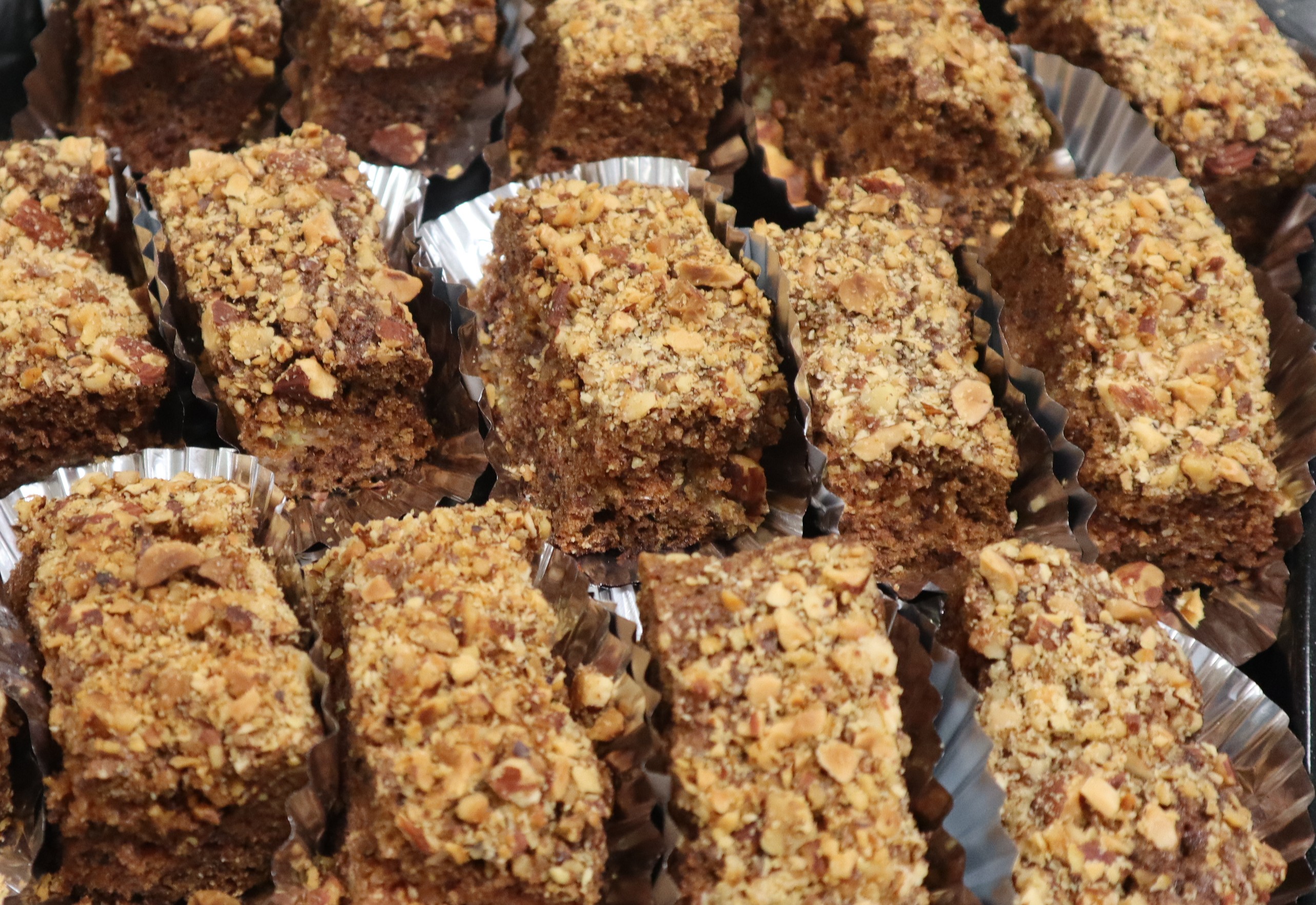 えびのナンプラー炒め、バナナケーキ、フルーツポンチです。