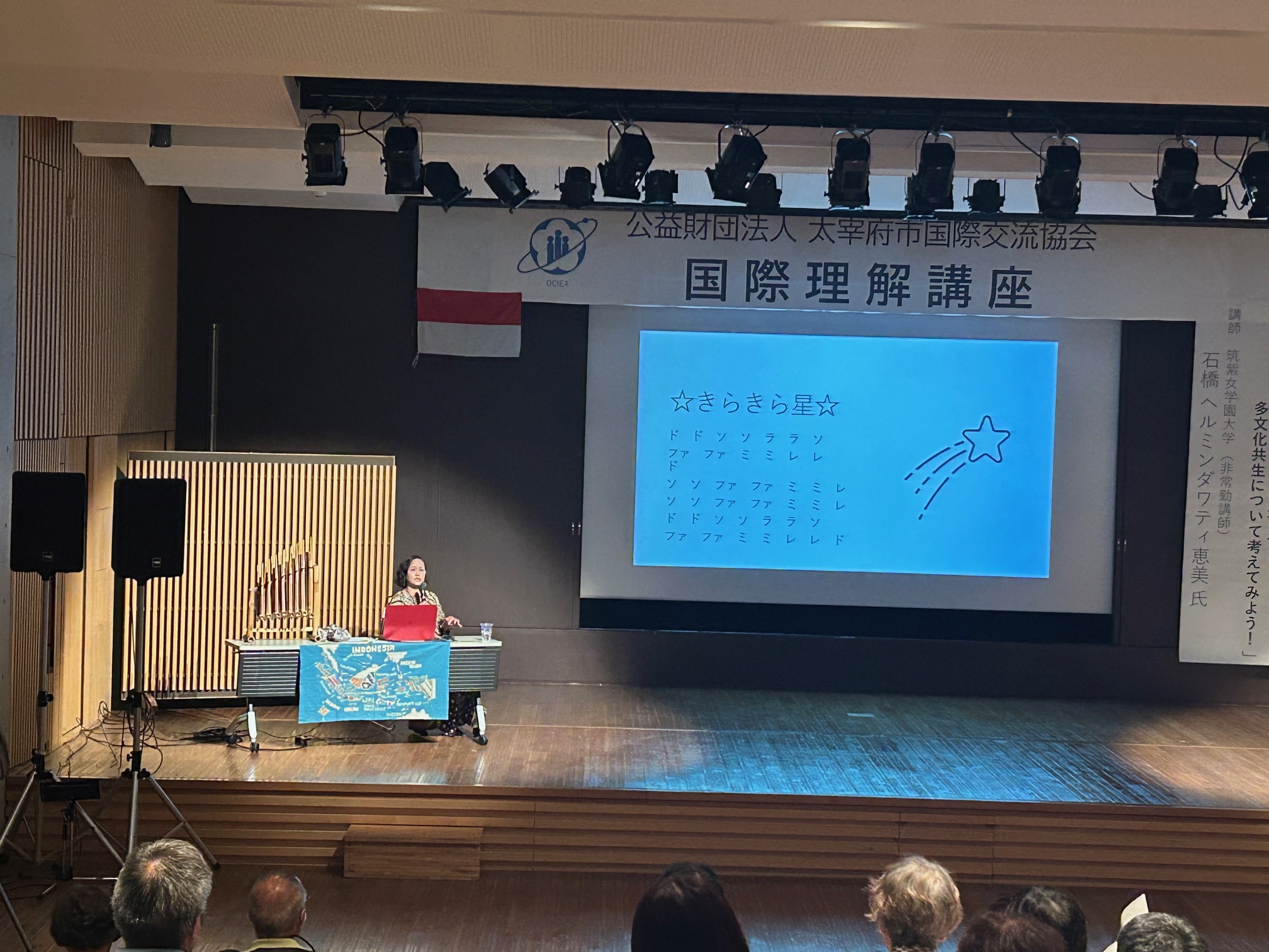 今回は、石橋ヘルミンダワティ恵美氏 (インドネシア・西ジャワ州スカブミ県出身) 筑紫女学園大学(非常勤講師)を講師に迎え、多様な民族・言語・宗教が共存する国であるインドネシアの文化・言語・音楽を通して多文化についてお話をしていただきました。