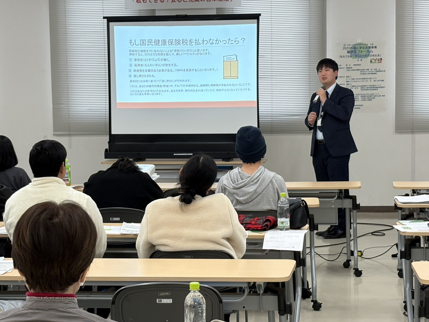 公的年金制度については、南福岡年金事務所、太宰府市役所の国保年金課、税務課の職員の方からお話をして いただきました。20歳から支払義務が生じること、学生の間は「学生納付特例」の適用もあるということ、また年金事務所や市役所からきた納付書や郵便物は放置せずに、心配があれば相談にきてほしいとのことでした。参加した留学生は、専門的で少し難しい内容でしたが日本で暮らしていく上での大切なこととして、配られた資料を見ながら真剣な表情で担当者の話を聞いていました。