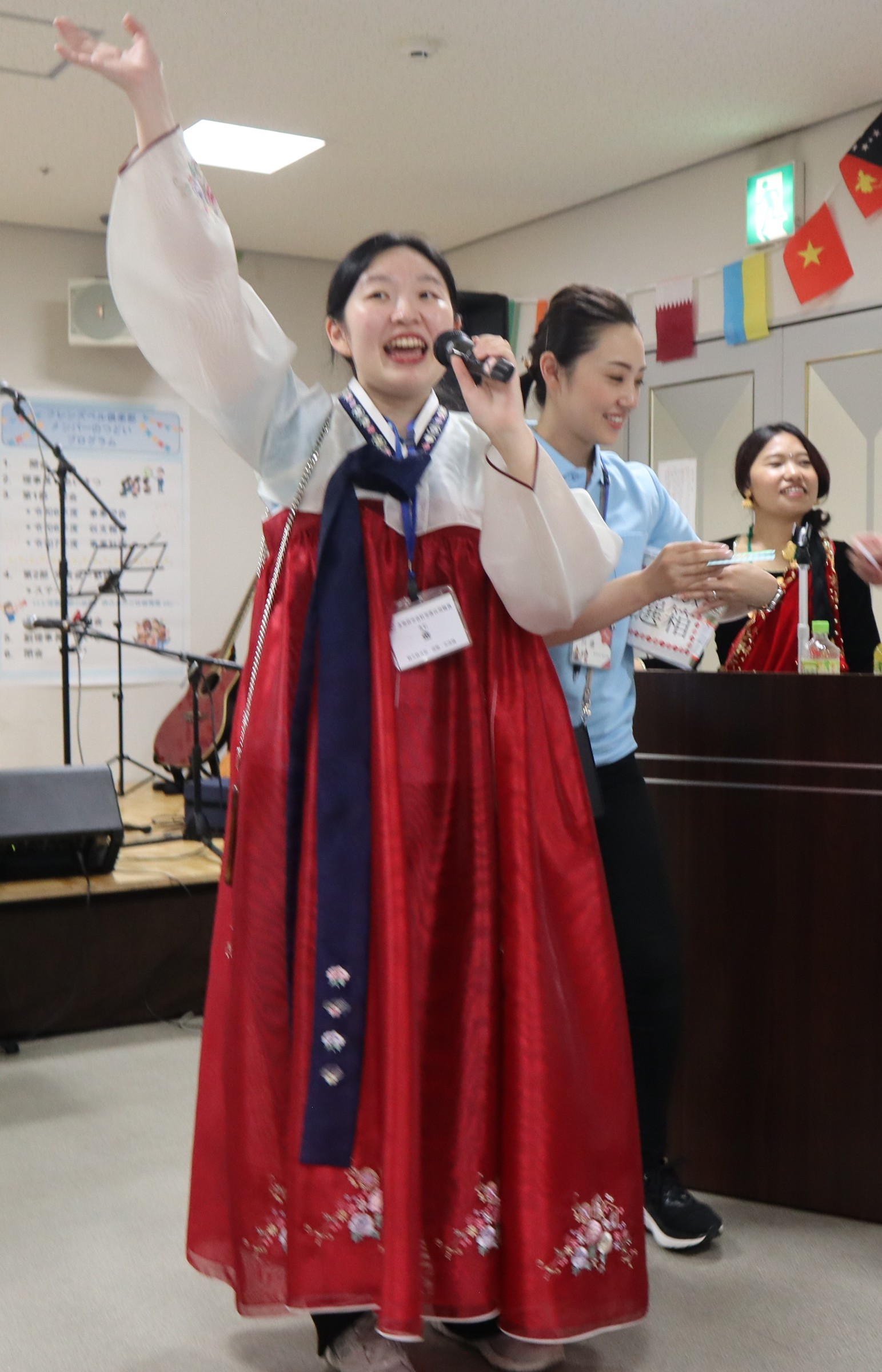 進行役は韓国の民族衣装「チマチョゴリ」を着た”太宰府市の国際交流員”金さん”です♪